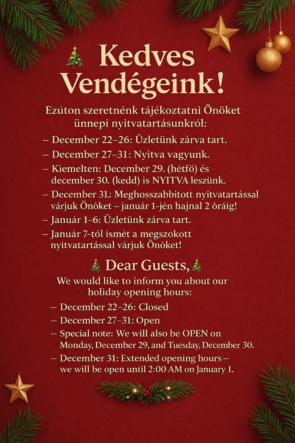 Értesítjük kedves vendégeinket, hogy éttermünk január 1–7. között zárva tart. Megértésüket köszönjük!
